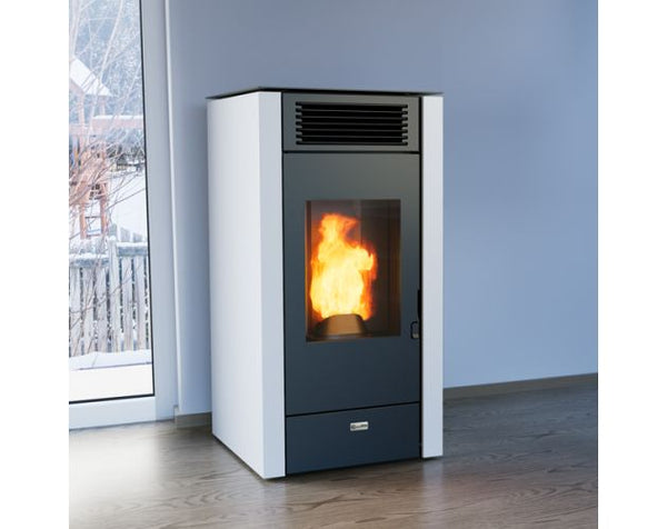 Estufa de pellet de color blanco con diseño moderno y fácil de manejar, equipada con mando a distancia para mayor comodidad.